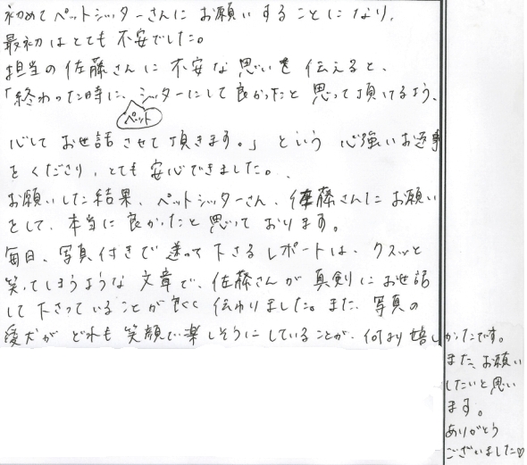 初めてペットシッターさんにお願いすることになり、最初はとても不安でした。担当の佐藤さんに不安な思いを伝えると「終わった時にペットシッターにして良かったと思って頂けるよう、心してお世話させて頂きます」という心強いお返事をくださり、とても安心できました。