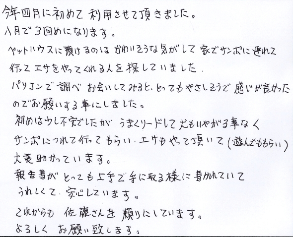 初めは少し不安でしたが、うまくリードして犬もいやがる事なくサンポにつれて行ってもらい、エサもやって頂いて(遊んでももらい)大変助かっています。