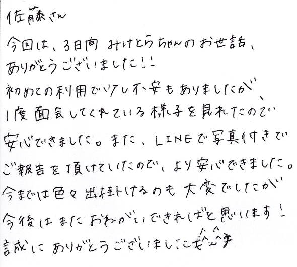 佐藤さん 今回は、3日間みけとらちゃんのお世話、ありがとうございました!!初めての利用で少し不安もありましたが、1度面会してくれている様子を見れたので安心できました。また、LINEで写真付きでご報告を頂けていたので、より安心できました。今までは色々出掛けるのも大変でしたが、今後はまたおねがいできればと思います!誠にありがとうございました。