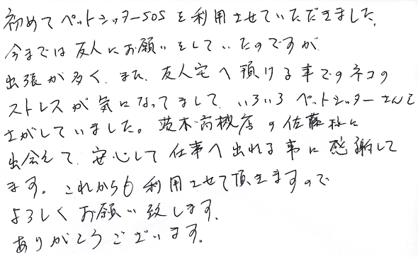 初めてペットシッターSOSを利用させていただきました。今までは友人にお願いをしていたのですが、出張が多く、また友人宅へ預ける事でのネコのストレスが気になってまして、いろいろペットシッターさんをさがしていました。茨木・高槻店の佐藤さんに出会えて、安心して仕事へ出れる事に感謝してます。これからも利用させて頂きますので、よろしくお願い致します。ありがとうございます。