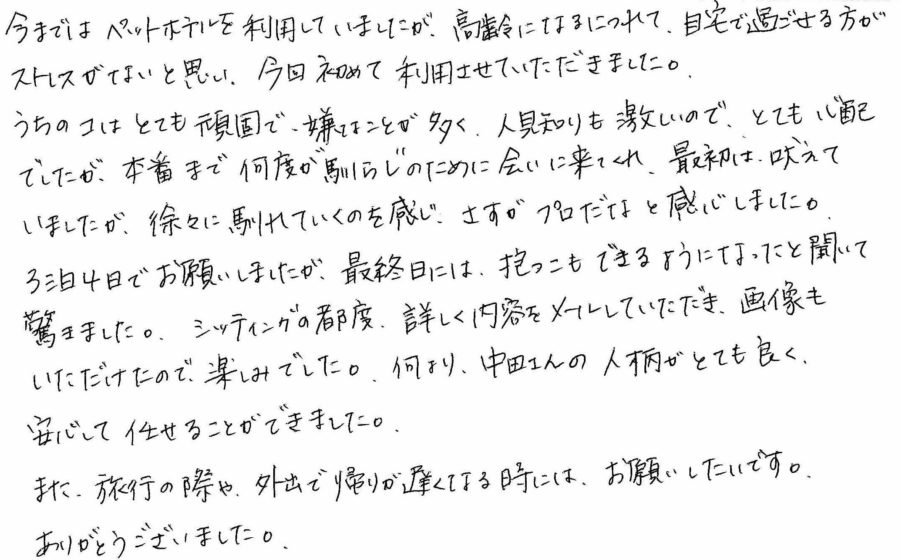 今まではペットホテルを利用していましたが、高齢になるにつれて、自宅で過ごせる方がストレスがないと思い、今回初めて利用させていただきました。
