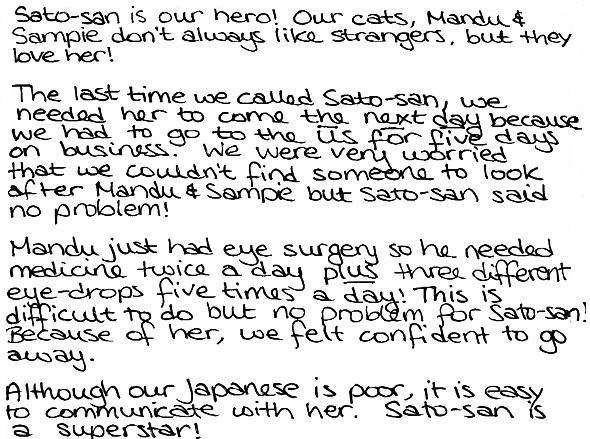 (佐藤さんは私たちのヒーローです。飼い猫のマンドゥとサンピーは人見知りで、他の人をいつも嫌がりますが、佐藤さんのことは大好きです。仕事で5日間アメリカに行かなければならず、翌日から来てもらう必要があったため、最終的に佐藤さんに連絡することになりました。ペットのお世話をお願いできる人が誰も見つからず困っていましたが、彼女は「問題ないですよ」と引き受けてくれました。マンドゥはちょうど目の手術を受けていたので、1日2回の薬服用と、加えて3種類の目薬を1日5回しなければいけませんでした。しかし、この困難なお願いにも、佐藤さんは「問題ありません」と快く引き受けてくれました。おかげで、私たちは安心して日本を離れることができました。私たちは日本語が苦手ですが、佐藤さんとは簡単にやりとりができました。彼女はスーパースターです。)
