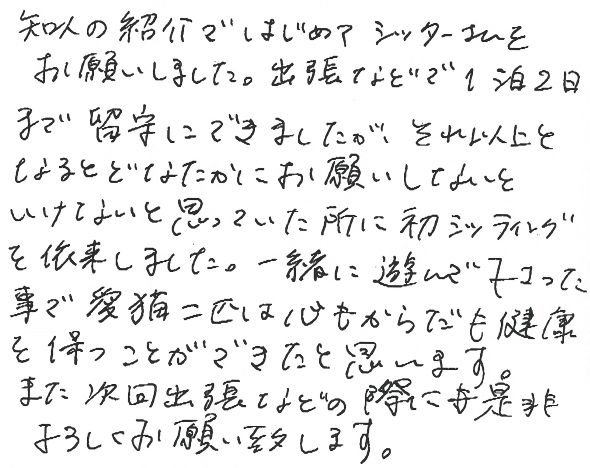 出張などで1泊2日まで留守にできましたが、それ以上となるとどなたかにお願いしないといけないと思っていた所に初シッティングを依頼しました。