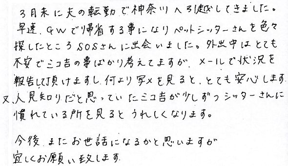 早速GWで帰省する事になりぺとシッターさんを色々探したところSOSさんに出会いました。