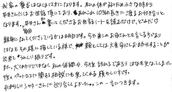 我家の愛犬はなは12才になります。私の体が弱いため、小さな時から平井さんにはお世話頂いており、かれこれ10年の長きに渡るお付き合いとなります。毎回平井さんが書いてくださるお世話ノートを読むだけで、どれだけ親身になってくださっているかは明白です。