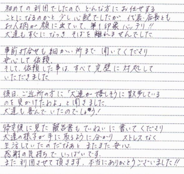 帰宅後に見た報告書もていねいに書いてくださり、犬達の様子が手に取るように分かり、ストレスなく生活していたのだなぁと、またまた安心、感謝の気持ちでいっぱいです。