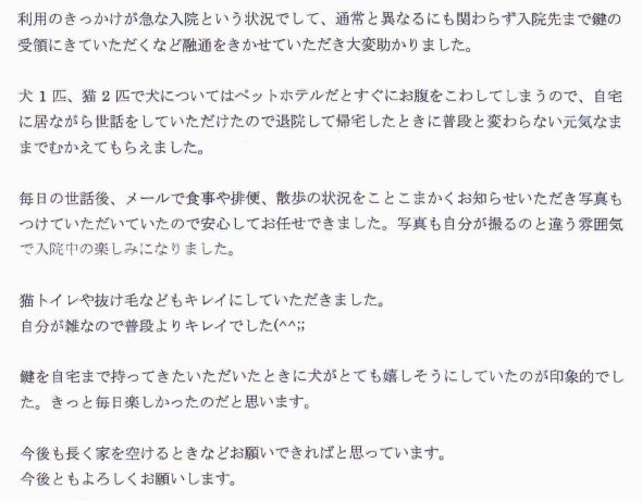 犬1匹、猫2匹で犬についてはペットホテルだとすぐにお腹をこわしてしまうので、自宅に居ながら世話をしていただけたので退院して帰宅したときに普段と変わらない元気なままでむかえてもらえました。