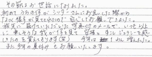 初めてうちの仔がシッターさんにお会いした際から、なつく様子が見てとれたので、安心してお願いできました。