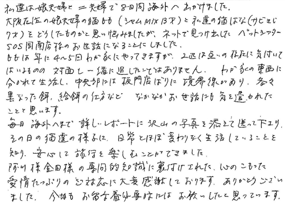 大阪在住の娘夫婦の猫もも(シャムMIX13才)と私達の猫はな(サビきじ7才)をどうしたものかと思い悩みましたが、ネットで見つけ出したペットシッターSOS周南店様のお世話になることにしました。