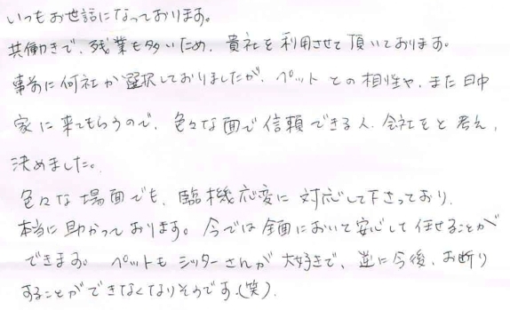 事前に何社か選択しておりましたが、ペットとの相性や、また日中家に来てもらうので、色々な面で信頼できる人、会社をと考え決めました。