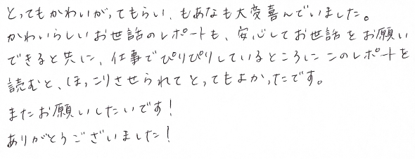 かわいらしいお世話のレポートも、安心してお世話をお願いできると共に、仕事でぴりぴりしているところにこのレポートを読むと、ほっこりさせられてとってもよかったです。