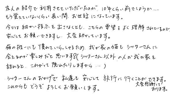 友人の紹介で利用させていただいたのが、10年ぐらい前でしょうか・・・。もう覚えていないくらい長い間お世話になっています。今では細かい指示を出さなくとも、こちらの要望をよく理解されているので、安心してお願いできますし、大変助かっています。猫の扱いにも慣れていらっしゃるため、我が家の猫もシッターさんに会えるのが楽しみだと思います!(シッターさん以外の人が我が家を訪れると、こわがって隠れたりしますから・・)
