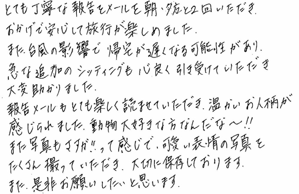 また、台風の影響で帰宅が遅くなる可能性があり、急な追加のシッティングも快く引き受けていただき大変助かりました。