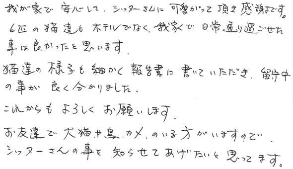 我が家で安心してシッターさんに可愛がって頂き感謝です。6匹の猫達もホテルではなく、我家で日常通り過ごせた事は良かったと思います。猫達の様子も細かく報告書に書いていただき、留守中の事が良く分かりました。これからもよろしくお願いします。お友達で犬猫や鳥、カメのいる方がいますので、シッターさんの事を知らせてあげたいと思っています。
