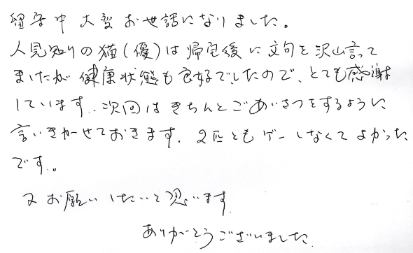 人見知りの猫(優)は帰宅後に文句を沢山言ってましたが、健康状態も良好でしたので、とても感謝しています。次回はきちんとごあいさつするように言いきかせておきます。2匹ともゲーしなくてよかったです。