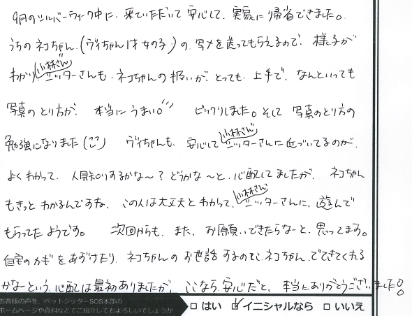 自宅のカギをあずけたり、ネコちゃんのお世話するのにネコちゃんでてきてくれるかな〜という心配は最初ありましたが、これなら安心だと、本当にありがとうございました!