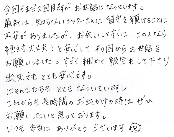 今回でまだ2回目ですがお世話になっています。最初は知らないシッターさんに留守を預けることに不安がありましたが、お会いしてすぐに、この人なら絶対大丈夫!と安心して初回からお世話をお願いしました。すごく細かく報告もして下さり、出先でもとても安心です。