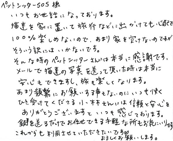 ペットシッターSOS様。いつもお世話になっております。猫達を家に置いて旅行などに出かけても心配で100%楽しめないので、あまり家を空けないのですが、そういう訳にはいかないです。そんな時のペットシッターさんは本当に感謝です。メールで猫達の写真を送って頂いた時は本当に安心もできますし、旅も楽しくなります。あまり頻繁にお願いする事もないのに、いつも快くひき受けてくださる小林さんには信頼と安心をありがとうございますといつも感じております。