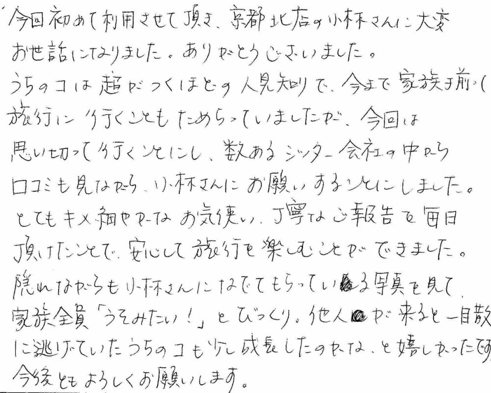 うちのコは超がつくほどの人見知りで、今まで家族揃って旅行に行くこともためらっていましたが、今回は思い切って行くことにし、数あるシッター会社の中から口コミも見ながら、小林さんにお願いすることにしました。