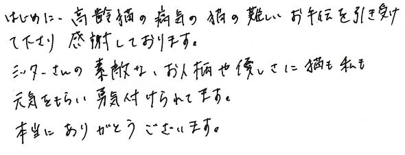 はじめに、高齢猫の病気の猫の難しいお手伝いを引き受けて下さり感謝しております。シッターさんの素敵なお人柄や優しさに、猫も私も元気をもらい勇気づけられてます。本当にありがとうございます。